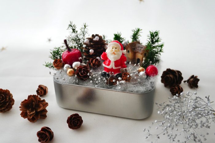 サンタさんのフィギュアやクリスマスのアイテムのプリザーブドや木の実を使って小さなオリジナルガーデンを作りましょう!