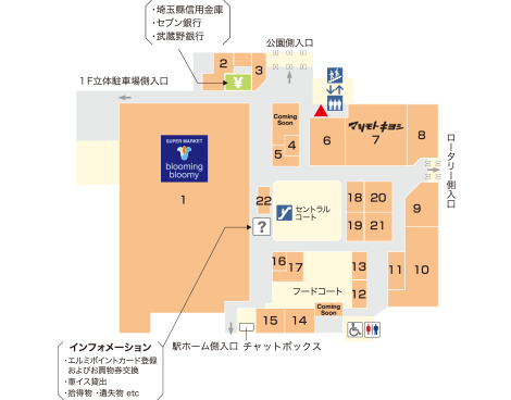 スーパーマーケット Tel. 048-544-0011 ヘアカット専門店 Tel. 0570-011-919 コーヒー豆・輸入食品 Tel. 048-594-9303 食のセレクトショップ Tel. 090-3554-2480 アジアンレストラン Tel. 048-543-8070 ファーストフード Tel. 048-540-7105 ファーストフード Tel. 048-540-7135 たこ焼き専門店 Tel. 080-9405-4510 合鍵・靴修理・印鑑 Tel. 048-543-8351 | |